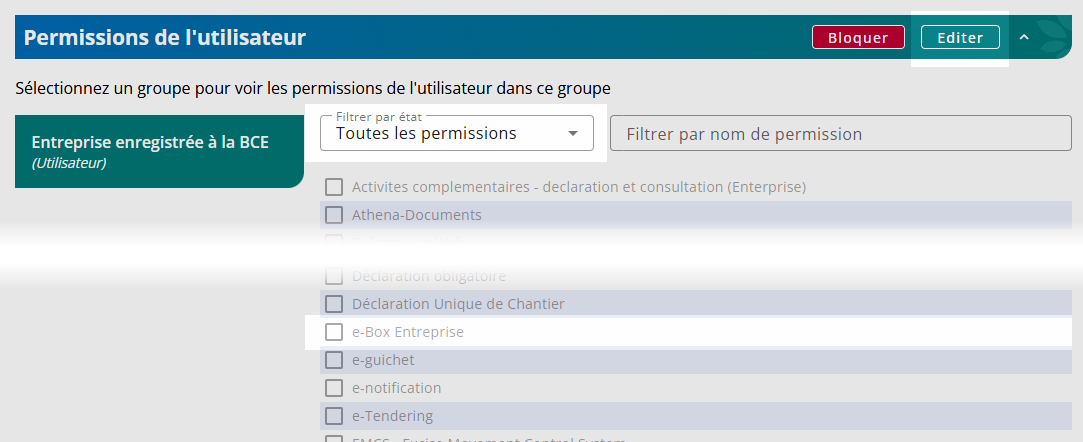 If you are modifying an existing user, first click on Editer on the user page, filter on Toutes les permissions, and select e-Box Enterprise.