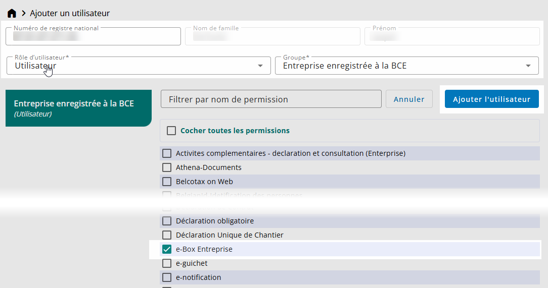 In the screen to add the user, make sure the national registration number is filled in, check e-Box Company, and confirm with Ajouter l'utilisateur (Add the user).