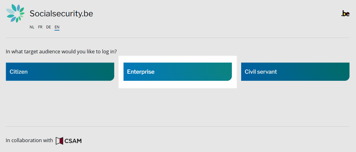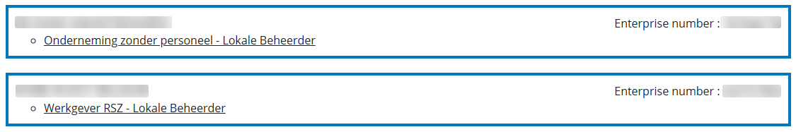 Then log in with, for example, Itsme or your eID card. On the next page, you can choose which company you want to manage. Depending on your situation, choose Company without personnel (Onderneming zonder personeel) or Employer RSZ (Werkgever RSZ).