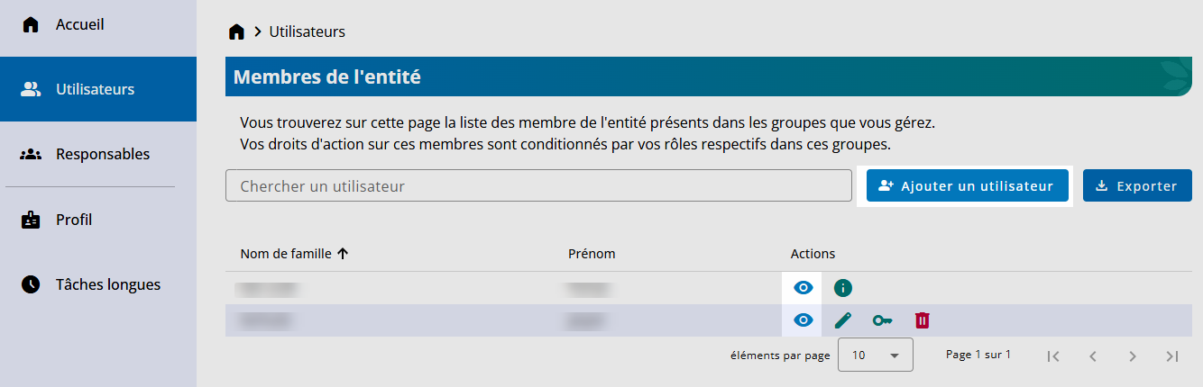 Unfortunately, the user interface of the government portal is not available in English from here on, so we're assuming you continue in the French version. Select Utilisateurs (Users) in the menu on the left. If the colleague you want to grant rights to is already in the list, click on the icon next to their name. If not, click on Ajouter un utilisateur (Add a user).